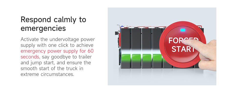 One-Click To Forced Start: Ntawm kev tsav tsheb ntev, qhov chaw nyuaj thiab huab cua huab cua ua rau lub roj teeb tsis tshua muaj kev sib tw rau cov tsheb thauj khoom. QiQiang tsheb pib BMS nta ib-nias rau yuam kev pib ua haujlwm uas tau tsim los daws qhov kev sib tw no. Nyob rau hauv cov rooj plaub uas tsis tshua muaj roj teeb voltage, ib tug yooj yim nias ntawm lub yuam kev pib hloov yuav qhib lub tsheb pib BMS lub yuam pib feature. Txawm hais tias nws tsis muaj lub zog txaus lossis qhov kub qis qis, koj lub tsheb tam sim no tau nruab rau lub zog los ntawm thiab txuas ntxiv mus.s voyage yam xyuam xim.