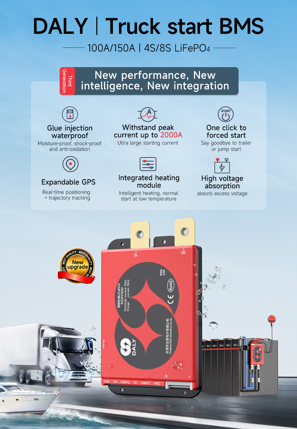 Txhawm rau ua kom tau raws li qhov xav tau loj hlob no, DALY tau pib Qiqiang lub tsheb thib peb pib BMS.Nws yog tsim rau 4-8S lithium hlau phosphate roj teeb pob thiab 10Slithium titanate roj teeb pob. Tus qauv them thiab tso tawm tam sim no yog 100A / 150A, thiab nws tuaj yeem tiv taus qhov tam sim no loj ntawm 2000A thaum lub sijhawm pib.